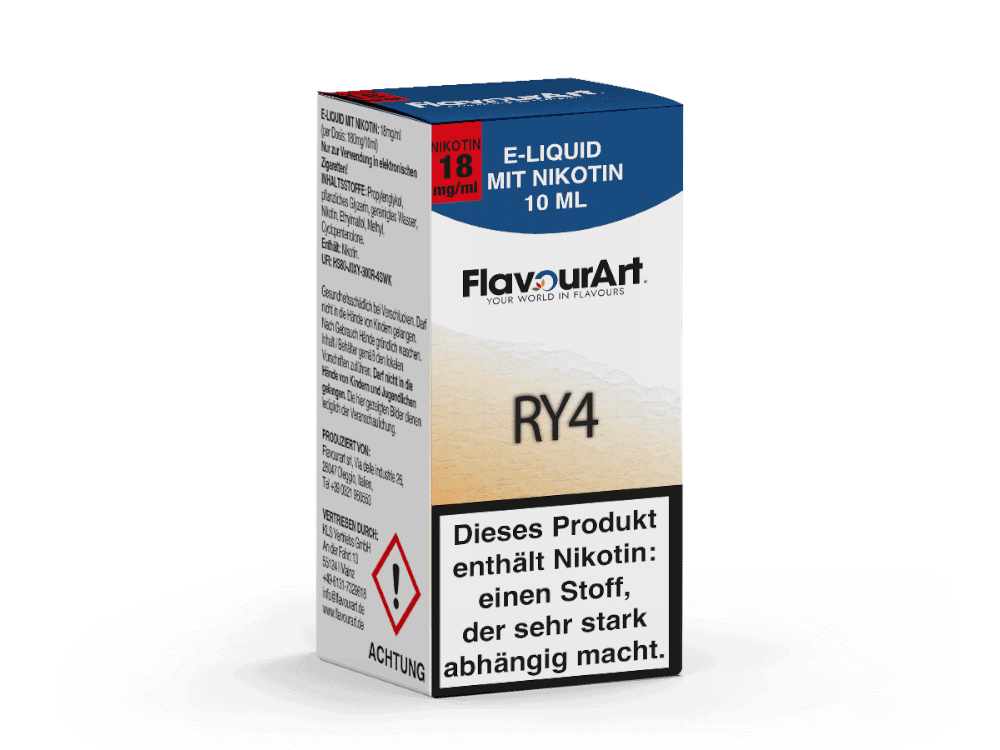 Das Liquid wird gebrauchsfertig in einer 10 ml PET-Flasche geliefert und verfügt über eine feine Tropfspitze für komfortables Nachfüllen. Die Nikotinkonzentrationen von 4,5 mg/ml, 9 mg/ml und 18 mg/ml ermöglichen eine individuelle Anpassung an das eigene Dampfverhalten. Produziert wird RY4 unter pharmazeutischen Standards in Italien – für ein gleichbleibend hochwertiges Dampferlebnis.