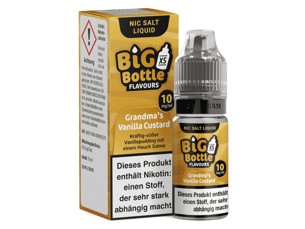 Bei der Auswahl Ihres Big Bottle Grandma’s Vanilla Custard Nikotinsalz Liquids haben Sie die Freiheit, die Nikotinstärke nach Ihren Vorlieben zu wählen. Sie können zwischen 10 mg/ml und 20 mg/ml wählen, um Ihr Dampferlebnis individuell anzupassen. Ob Sie eine milde oder kräftige Nikotinintensität bevorzugen, dieses Liquid erfüllt Ihre persönlichen Bedürfnisse.