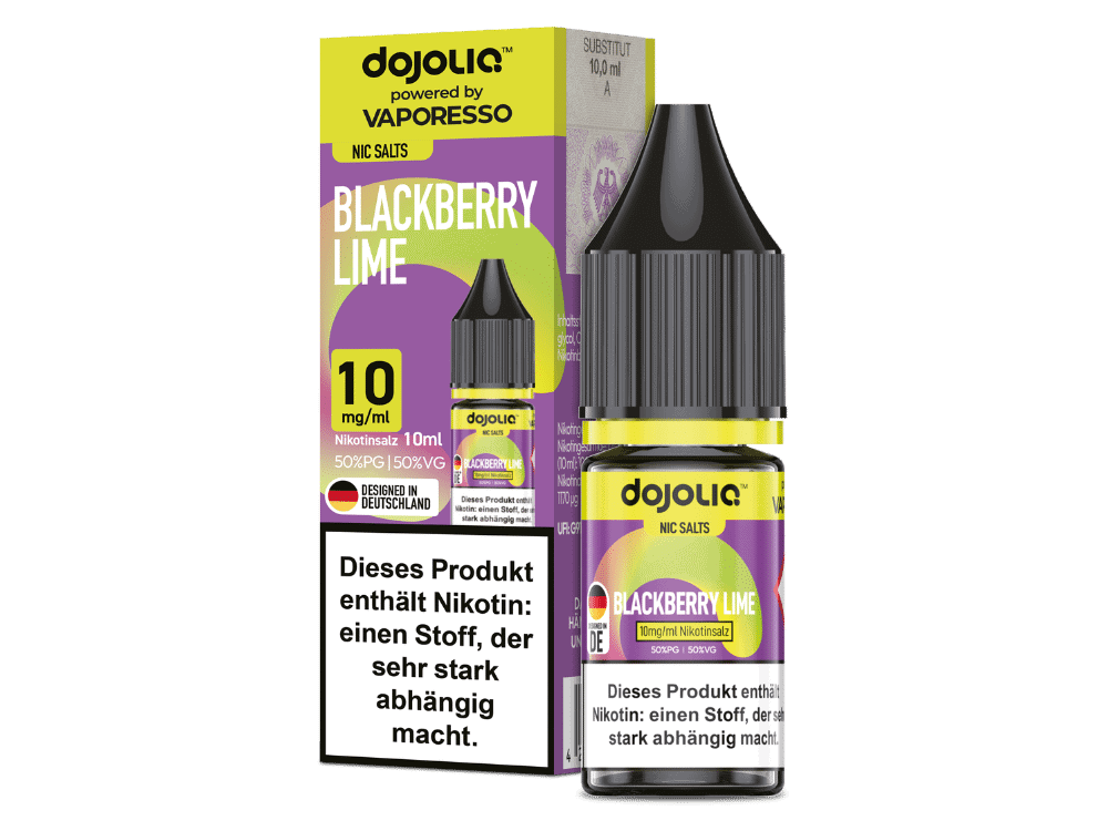 Das Dojoliq Blackberry Lime wird in praktischen 10 ml Flaschen geliefert und ist in den Nikotinstärken 10 mg/ml und 20 mg/ml erhältlich. Es ist sofort gebrauchsfertig und kann direkt nach dem Öffnen verwendet werden – ohne Mischen oder Reifezeit.