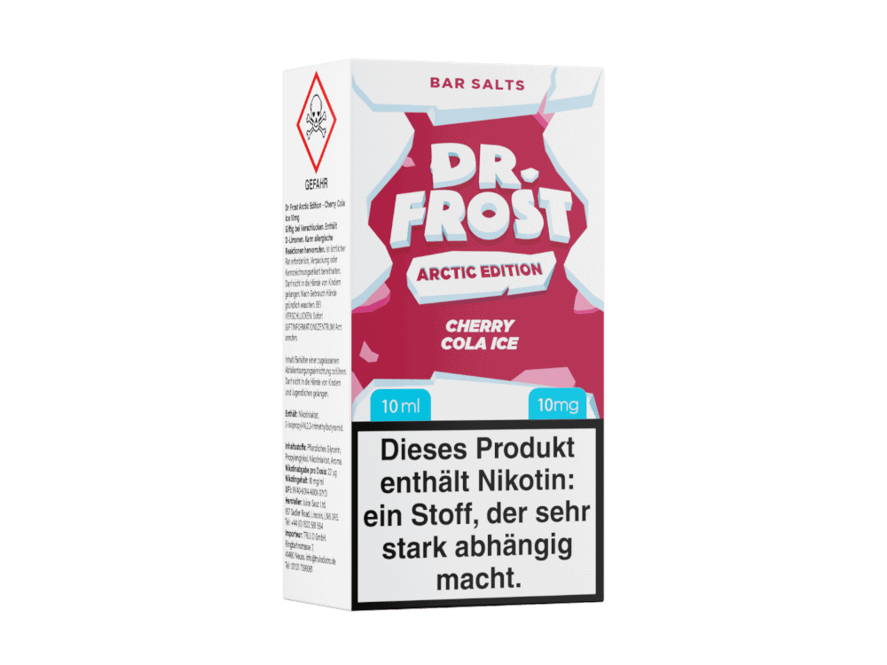 Das Dr. Frost – Arctic Edition – Cherry Cola Ice Nikotinsalz Liquid bringt Ihnen das kultige Erlebnis einer eisgekühlten Cherry Cola direkt in Ihre E-Zigarette. Eine perfekte Wahl für alle, die die Kombination aus fruchtiger Kirsche, spritziger Cola und einem Hauch von Kühle lieben. Lassen Sie sich von diesem einzigartigen Geschmackserlebnis erfrischen und verwöhnen – zu jeder Tageszeit!