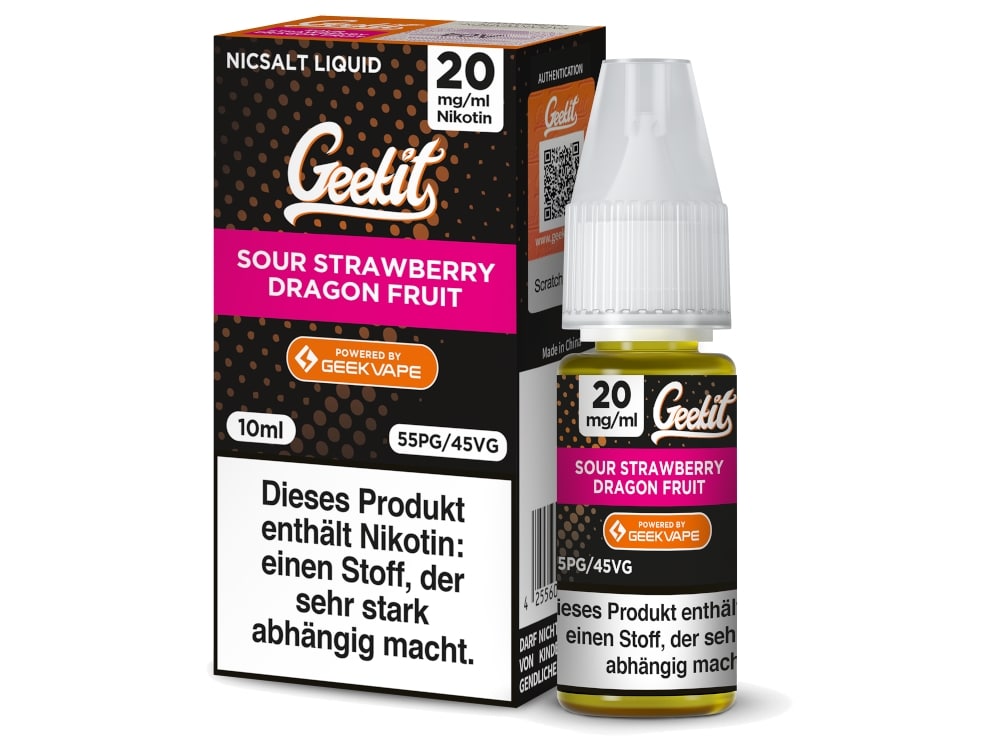 Das Sour Strawberry Dragon Fruit Nikotinsalz Liquid von Geekit kombiniert zwei Welten des Fruchtgenusses: die verführerische Süße sonnengereifter Erdbeeren mit dem leicht herben, exotischen Geschmack von Drachenfrucht. Doch das ist noch nicht alles – ein säuerlicher Kick bringt Spannung in jedes Zugerlebnis, während eine feine Frische den Mix abrundet und für angenehme Kühle sorgt. Das Ergebnis: ein überraschend vielschichtiges Liquid, das sowohl fruchtliebende als auch experimentierfreudige Dampfer begeistert.