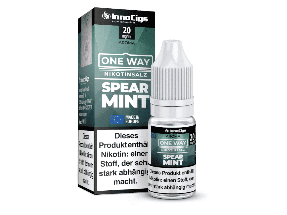 Aus dem Hause InnoCigs kommen die Nikotinsalz Liquids der Reihe One Way. Die Sorte Spearmint schmeckt beim Dampfen mit einer E-Zigarette nach Minze und Menthol. Das Nikotinsalz Liquid kann sofort mit einer E-Zigarette verdampft werden und ist in den Stärken 0 mg/ml, 10 mg/ml und 20 mg/ml erhältlich.