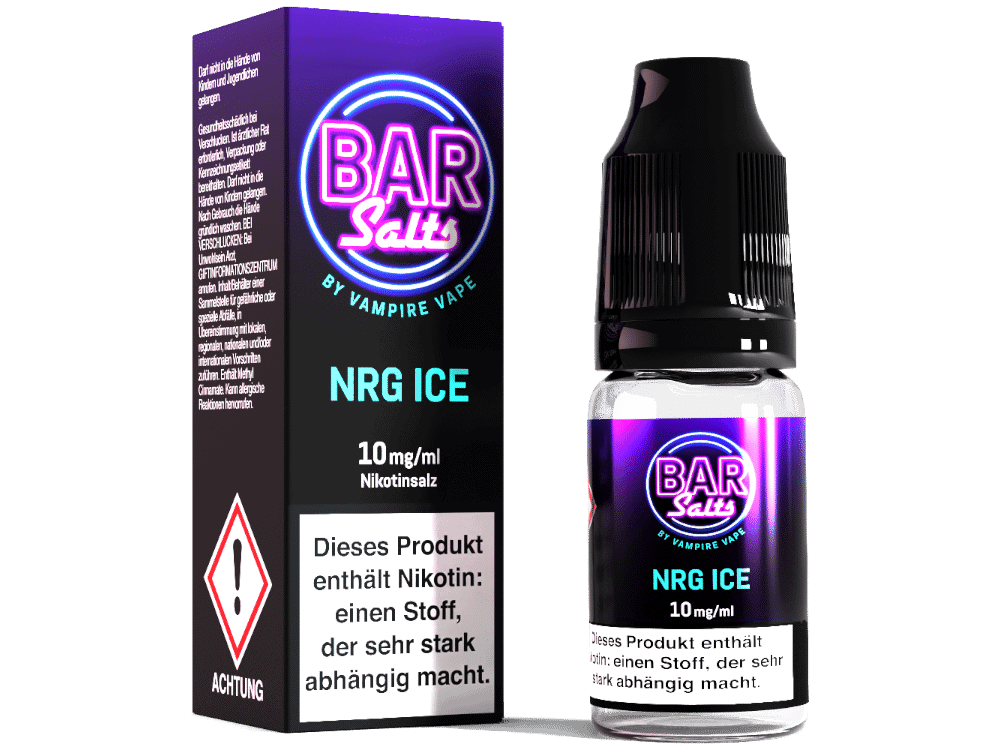 Das Bar Salts NRG Ice Nikotinsalz Liquid von Vampire Vape ist der perfekte Energieschub für alle, die beim Dampfen auf einen erfrischenden Geschmack und einen extra Kick Energie setzen. Dieses Liquid kombiniert den Geschmack eines erfrischenden Energydrinks mit einer kühlenden Frische, die Sie direkt ins nächste Level katapultiert.
