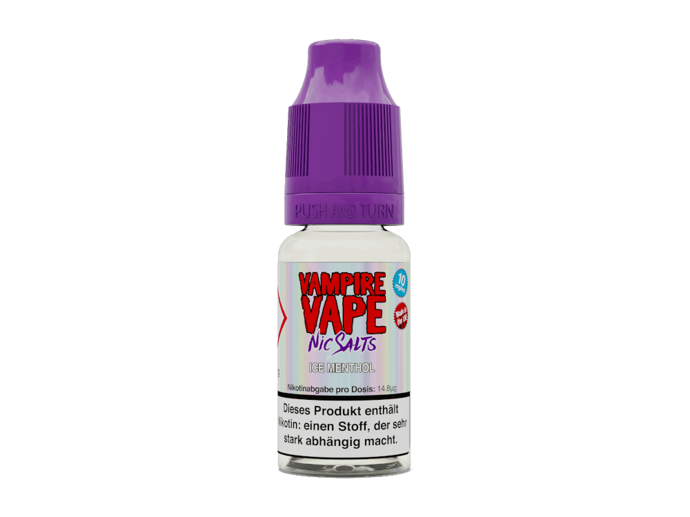 Bei den Vampire Vape Nikotinsalz Liquids haben Sie die Wahl zwischen 10 mg/ml und 20 mg/ml. Pro Variante und Flasche sind insgesamt 10 ml Vampire Vape Nikotinsalz Liquid enthalten. Die Sorte Ice Menthol kann direkt gedampft werden und entwickelt beim Dampfen den Geschmack von Menthol und Minze.
