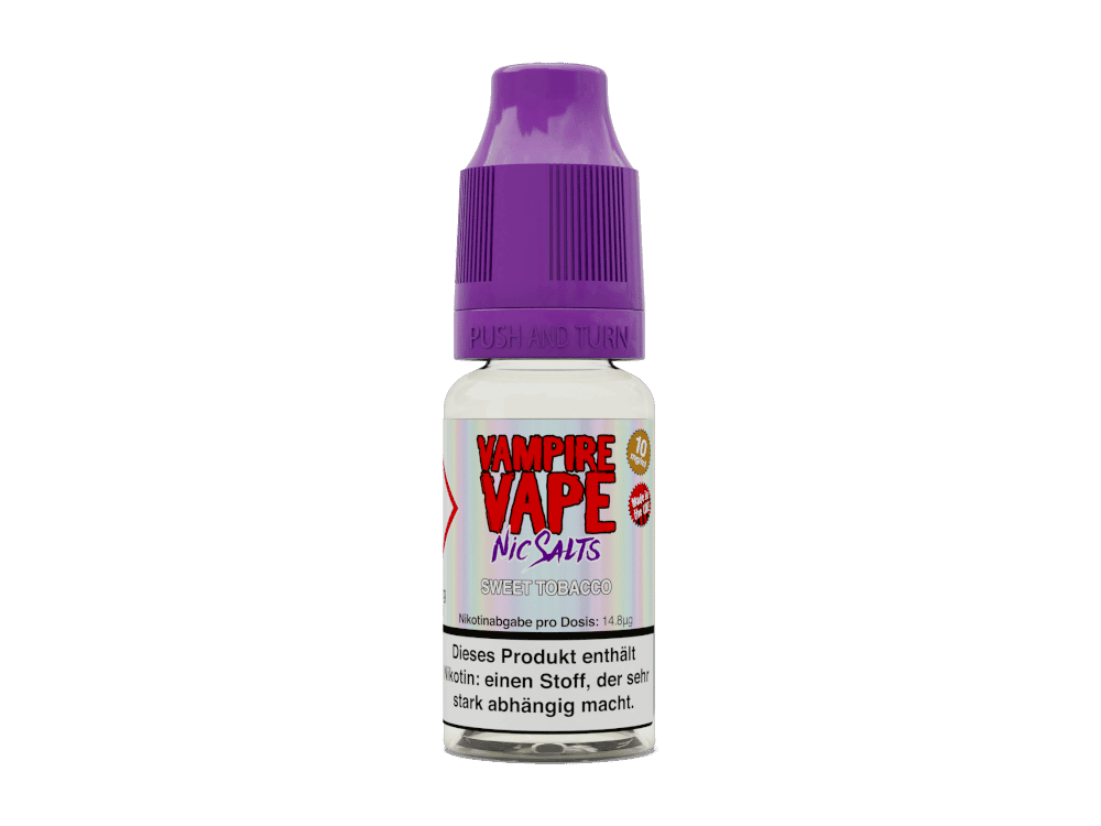 Bei den Vampire Vape Nikotinsalz Liquids haben Sie die Wahl zwischen 10 mg/ml und 20 mg/ml. Pro Variante und Flasche sind insgesamt 10 ml Vampire Vape Nikotinsalz Liquid enthalten. Die Sorte Sweet Tobacco kann direkt gedampft werden und entwickelt beim Dampfen den Geschmack von Tabak mit einer einer Karamellnote.