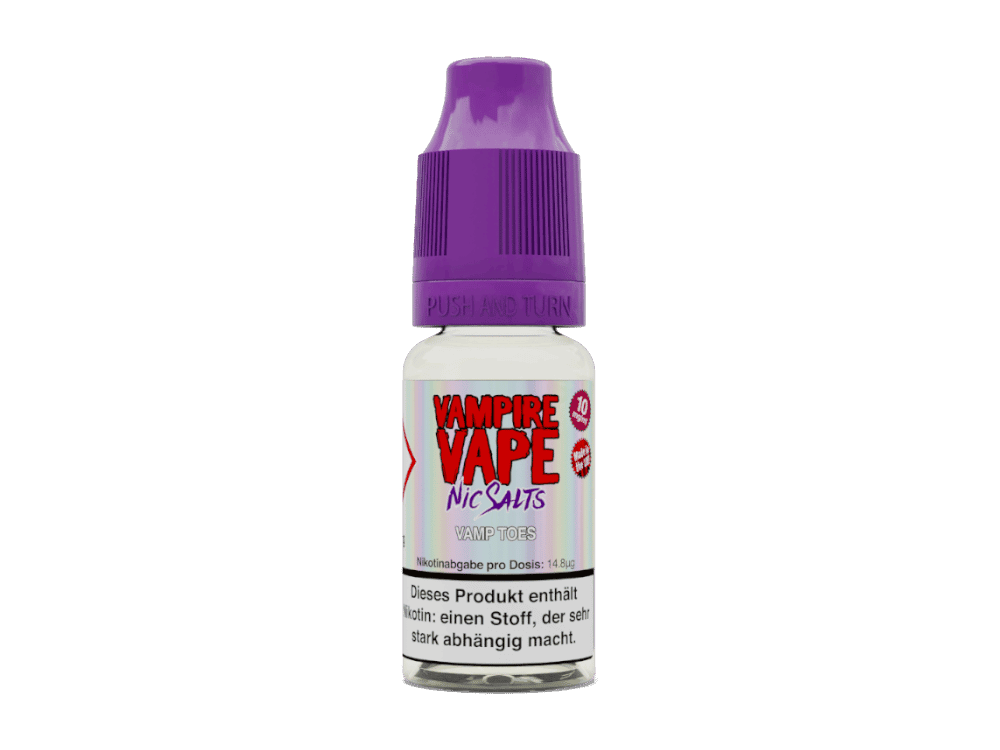 Bei den Vampire Vape Nikotinsalz Liquids haben Sie die Wahl zwischen 10 mg/ml und 20 mg/ml. Pro Variante und Flasche sind insgesamt 10 ml Vampire Vape Nikotinsalz Liquid enthalten. Die Sorte Vamp Toes kann direkt gedampft werden und entwickelt beim Dampfen den Geschmack von schwarzen Johannisbeeren, Himbeeren und Trauben.